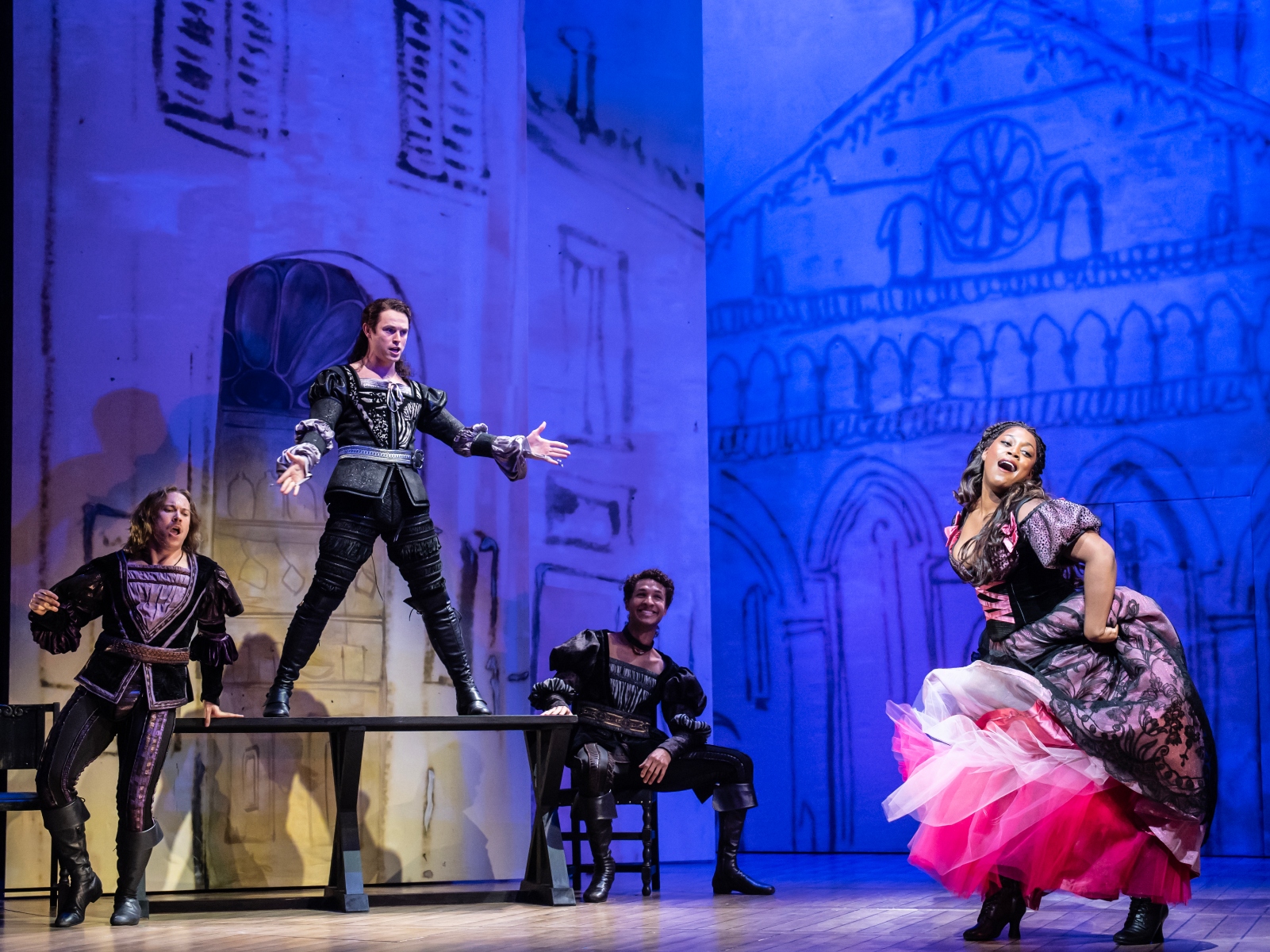 Non perdetevi questa meravigliosa storia nella storia. Prenota subito i tuoi biglietti Kiss Me Kate e sperimenta set straordinari, splendidi costumi d'epoca, melodie di spettacoli popolari e una recitazione altamente qualificata e assolutamente convincente. Fantastico!