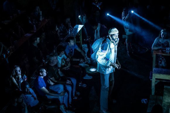 The auditorium has been transformed into the world of the Afghan Café in the Calais Jungle. The Calais camp was largely organised by nationality, and the auditorium space has been designed to reflect this.’